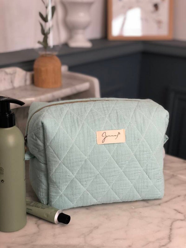 Trousse de toilette en double-gaze de coton, elle se complète parfaitement avec la trousse de beauté pour le voyage.